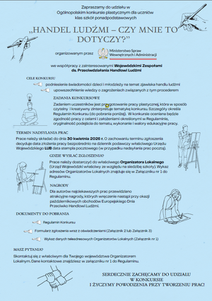 Ministerstwo Spraw Wewnętrznych i Administracji, we współpracy z zainteresowanymi Wojewódzkimi Zespołami ds. Przeciwdziałania Handlowi Ludźmi, ogłasza ogólnopolski konkurs plastyczny skierowany do uczniów szkół ponadpodstawowych. Celem inicjatywy jest zwiększenie świadomości młodych ludzi na temat zagrożeń związanych ze współczesnym niewolnictwem.