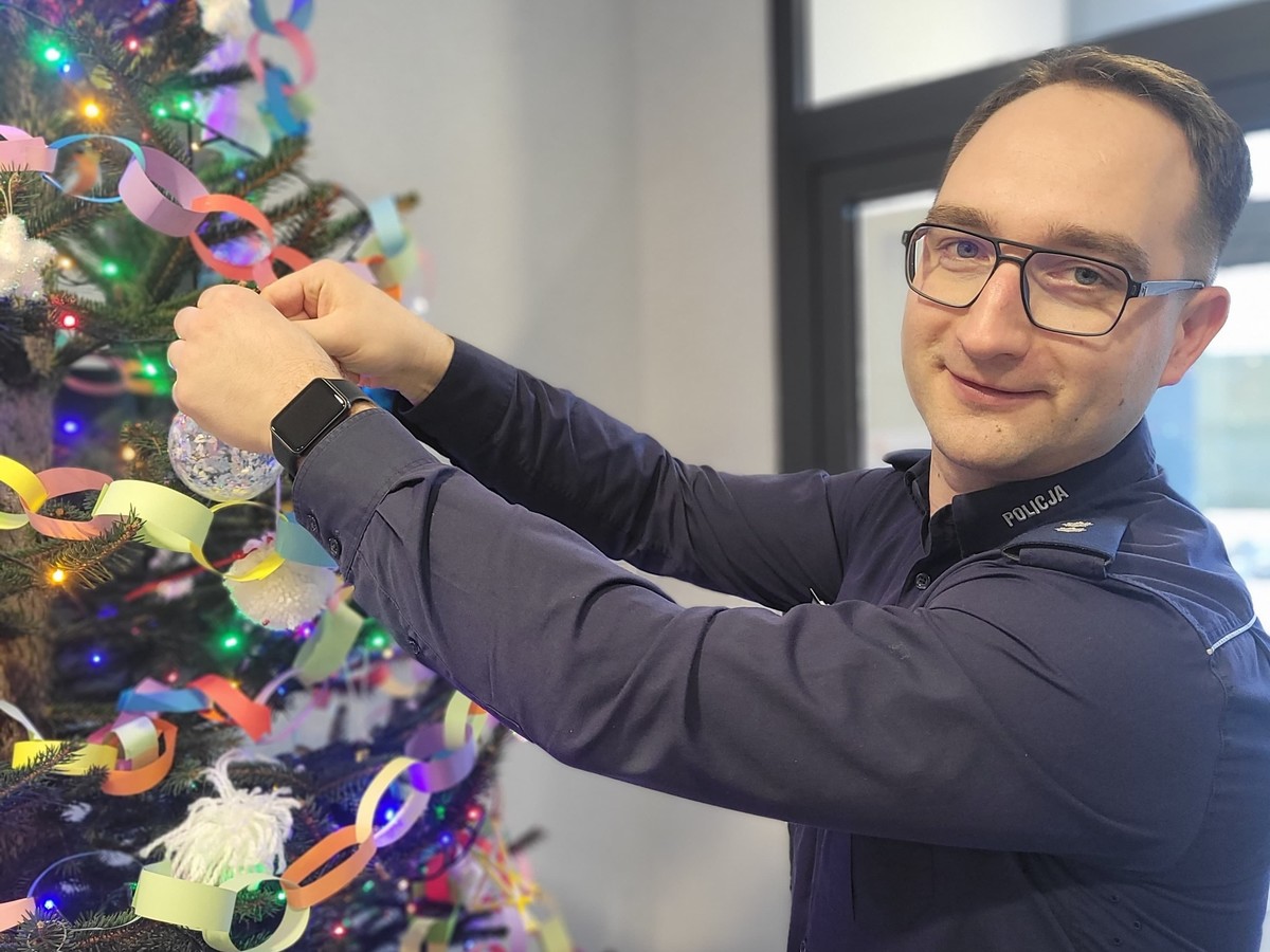 Dzieci przybyły do komendy z własnoręcznie przygotowanymi ozdobami. Każdy mały artysta mógł zawiesić wspólne ozdoby na świątecznym drzewku, a policjanci z dumą pomagali w ich rozmieszczaniu. Wspólne ubieranie choinki stało się okazją nie tylko do twórczej zabawy, lecz także do integracji i budowania pozytywnych relacji między najmłodszymi mieszkańcami gminy a mundurowymi.