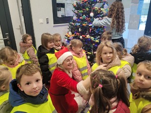 Po zakończonym strojenia choinki przedszkolaki wspólnie z policjantami złożyli sobie świąteczne życzenia. Nie zabrakło również krótkiej rozmowy na temat bezpieczeństwa podczas zimowych zabaw i świątecznych wyjazdów.