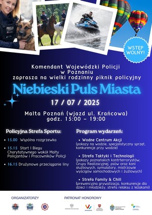 Komendant Wojewódzki Policji w Poznaniu zaprasza 17 lipca br. na wielki rodzinny piknik policyjny "Niebieski Puls Miasta". Wszystkich serdecznie zapraszamy!